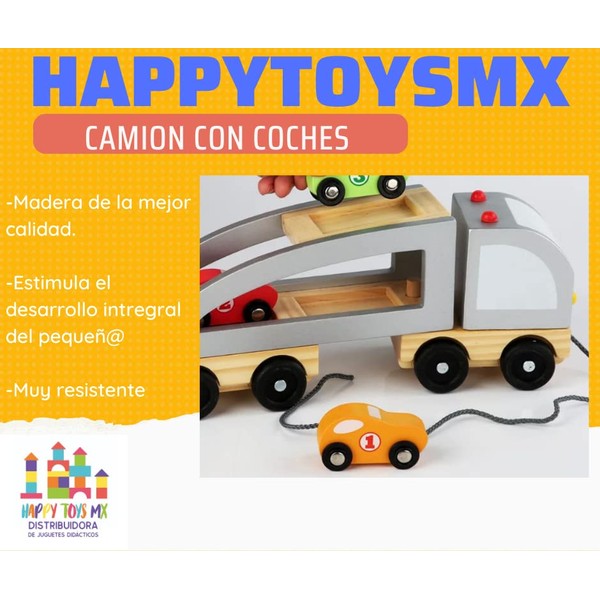 - CAMION CON COCHES | Este divertido set incluye 3 cochecitos de madera en colores variados y 1 camión para transportarlos. Además, incluye una bolsa ecológica de HappyToysMX para guardar y transportar. Muy resistente y seguro, sin piezas pequeñas o desarmables. ¡Diversión segura! Recomendamos su uso a partir de los 12 meses.
