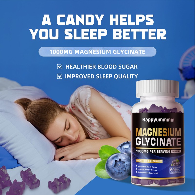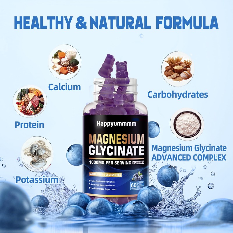 Happyummmm Magnesium Glycinate Gummies 1000mg - Sugar Free Magnesium Potassium Supplement with Vitamin D, B6, CoQ10 for Calm Mood & Sleep Support - 60 Blueberry Gummies