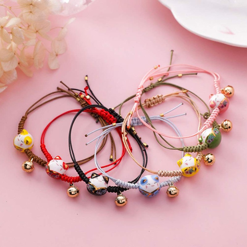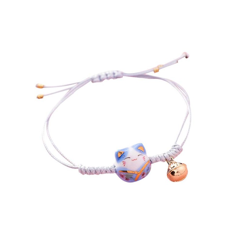Happyyami Lucky Cat Bracelet Cute Cartoon Good Luck String Braided Beads Bell Wrist Chain for Friend Lover (Blue)