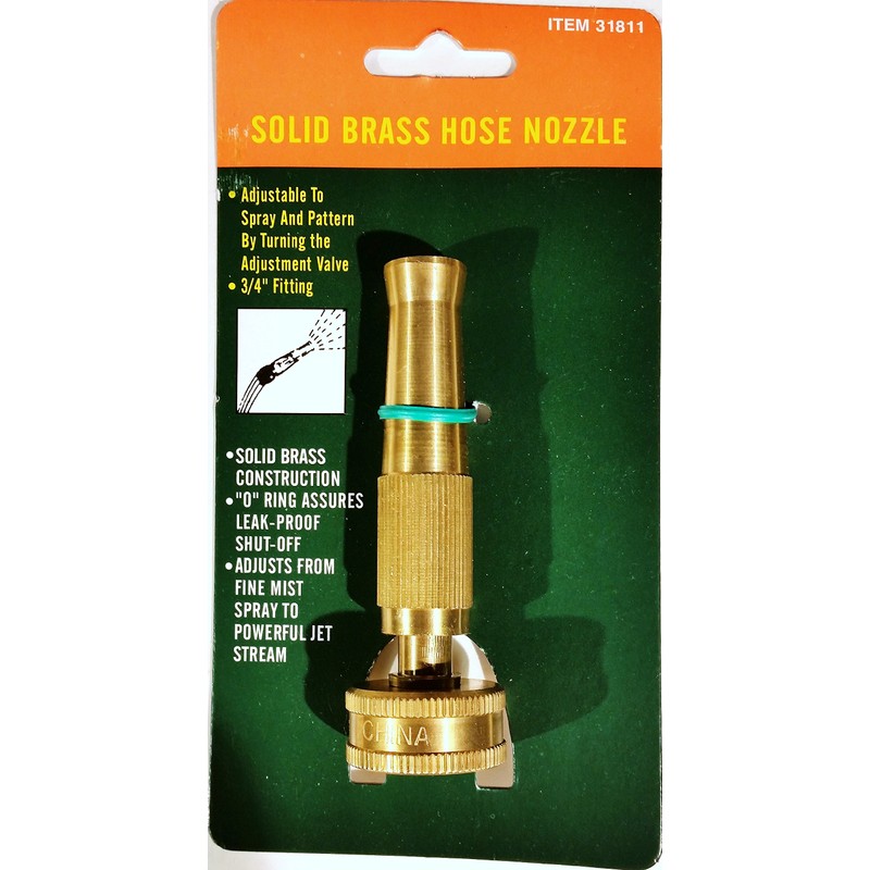 Brass garden hose nozzle is 4 inches long in the open position. Connects to 3/4" male garden hose connector with a standard 3/4 inch female garden hose connector. Includes a black compressible rubber "O" ring hose washer that assures a leak-proof shut-off of garden hose in the fully closed position. Adjustable spray and pattern is achieved by turning the nozzle barrel with knurled grip that rotates an adjustment valve inside the nozzle body. Adjusts From fine mist spray to powerful jet stream while retaining adjustment position.