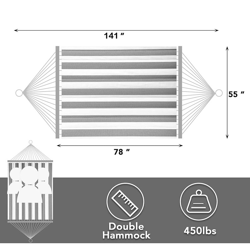 - Large Capacity: Our hammock is large enough to accommodate 2 person; The hammock bed size is 77 x 55 inch, 12 Feet hammock with 2 steel chain links; Double hammock with wood spreader bar, it’s designed to safely support a maximum capacity of 450 pounds