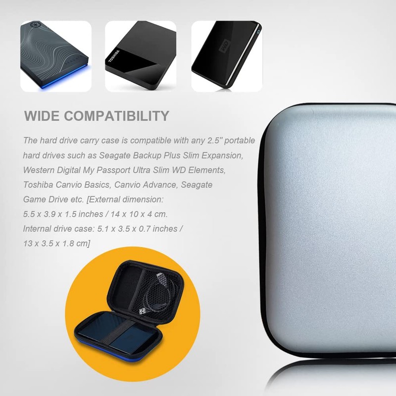 - ● | WIDE COMPATIBILITY | - The hard drive carry case is compatible with any 2.5" portable hard drives such as Seagate Backup Plus Slim Expansion, Western Digital My Passport Ultra Slim WD Elements, Toshiba Canvio Basics, Canvio Advance, Seagate Game Drive etc.[External dimension: 5.5 x 3.9 x 1.5 inches / 14 x 10 x 4 cm. Internal drive case: 5.1 x 3.5 x 0.7 inches / 13 x 3.5 x 1.8 cm]