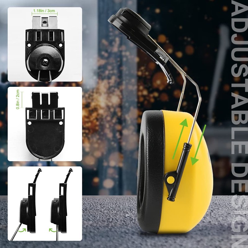 - 【Fits Most】:Compatible with most Safety helmets (NOT for Full Brim Hard Hats).Designed with retractable stainless steel at the cap-mount Earmuffs, the ear muffs can be adjusted to fit all sizes.Earcup pivot points tilt for a fit that is customized to each person who wears the earmuffs.
