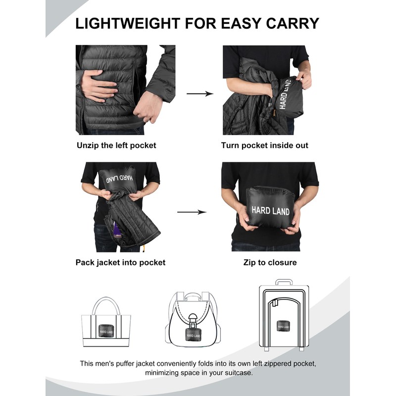 - PACKABLE DOWN JACKET: The down coat can be packed into its own left pocket, which is about 9.4" long and 7.8" wide, for easy carrying.