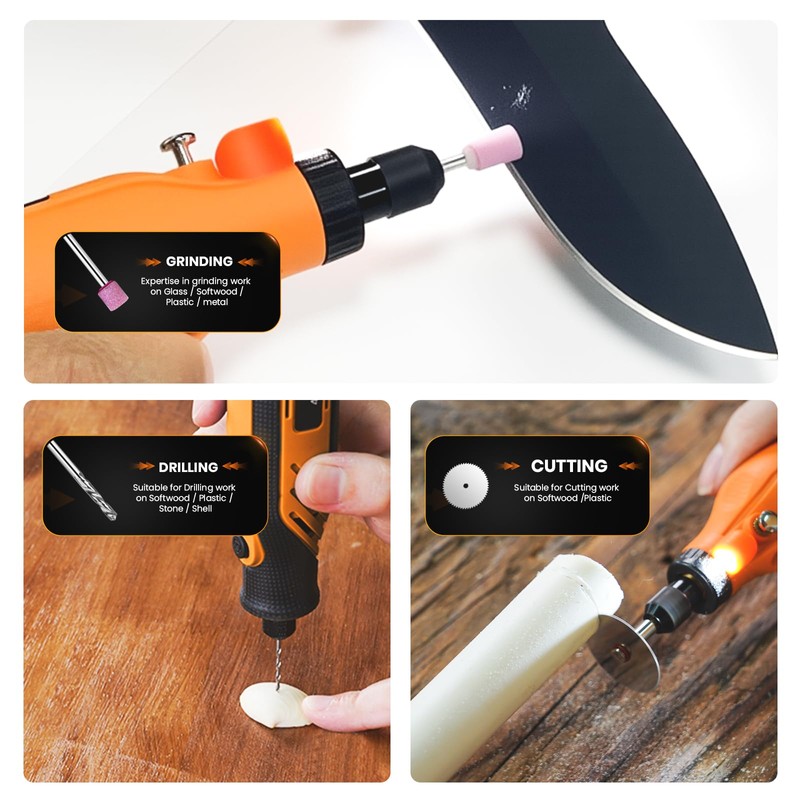 Sanding ring 150 mesh x15, rench x1, chuck x3 (1.0/1.6/2.3mm), cutting disc x2, wool wheel x2, grinding head x5, grinding roller x1, cutting handle x1, engraving head x6, drill bit x3 (1.0/1.6/2.3mm) and sandpaper sheet x31.