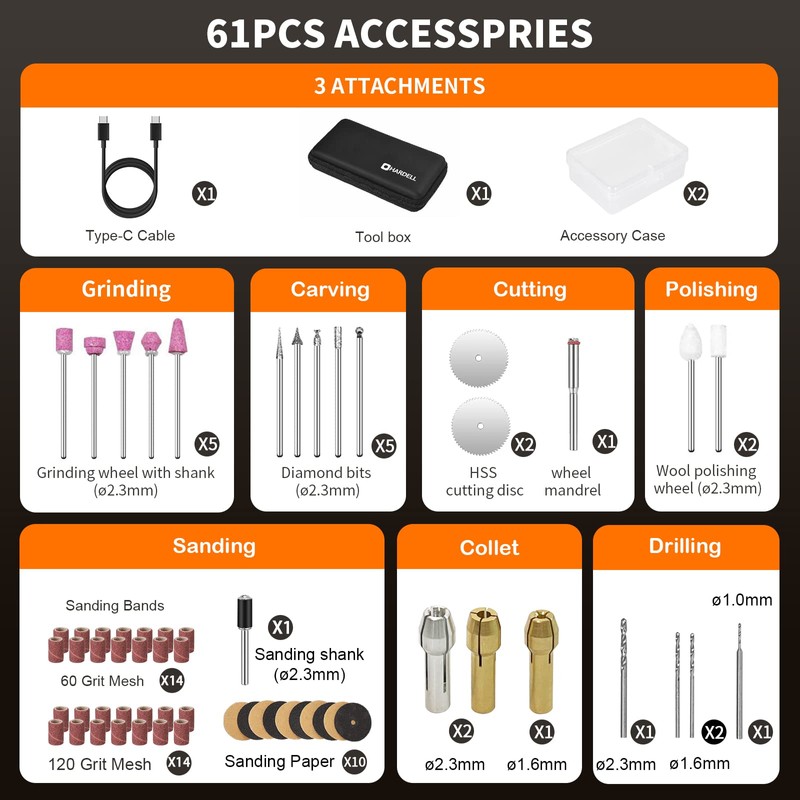 - 【Versatile Rotary Tool Set】This rotary tool set includes a high-performance and low-noise rotary tool with 61 of the most popular power rotary tool accessories for fine DIY work. Ideal for carving, sanding, grinding, polishing, or cutting, this electric rotary tool is perfect for creating resin crafts. It's like having a whole toolbox in one convenient package. Note: Not suitable for heavy-duty projects