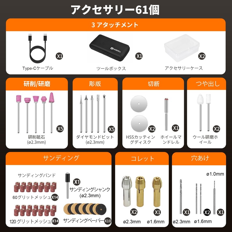 - (Wide Variety of Attachments) High-performance, low-noise cordless rotation tool is suitable for DIY detailed work. The set includes 1 mini router, 61 attachments, 1 box, 1 USB charging cable, and 1 Japanese instruction manual. If you have any problems, please feel free to contact us. Note: After you receive the product, please charge the product according to the instructions before using