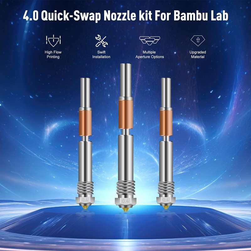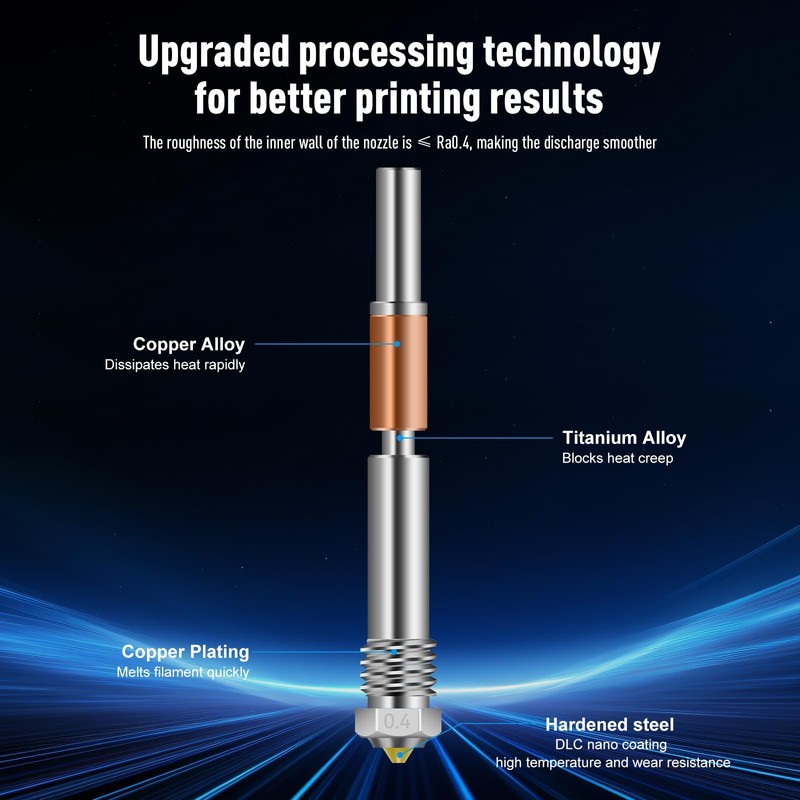 - 【Universal Compatibility】0.4mm precision orifice works flawlessly with PLA, ABS, PETG, carbon fiber-filled materials, and engineering-grade filaments