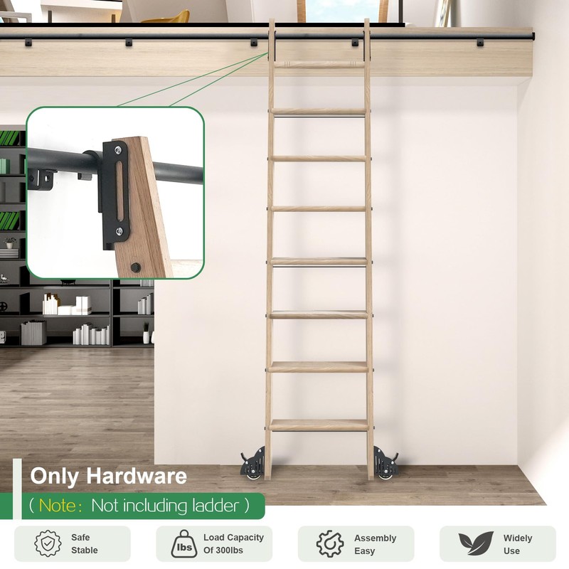 HARDJULAN 8FT Telescopic Hook on Sliding Library Ladder Hardware,Includes Bottom Wheel with Brake,MAX Load 300lbs