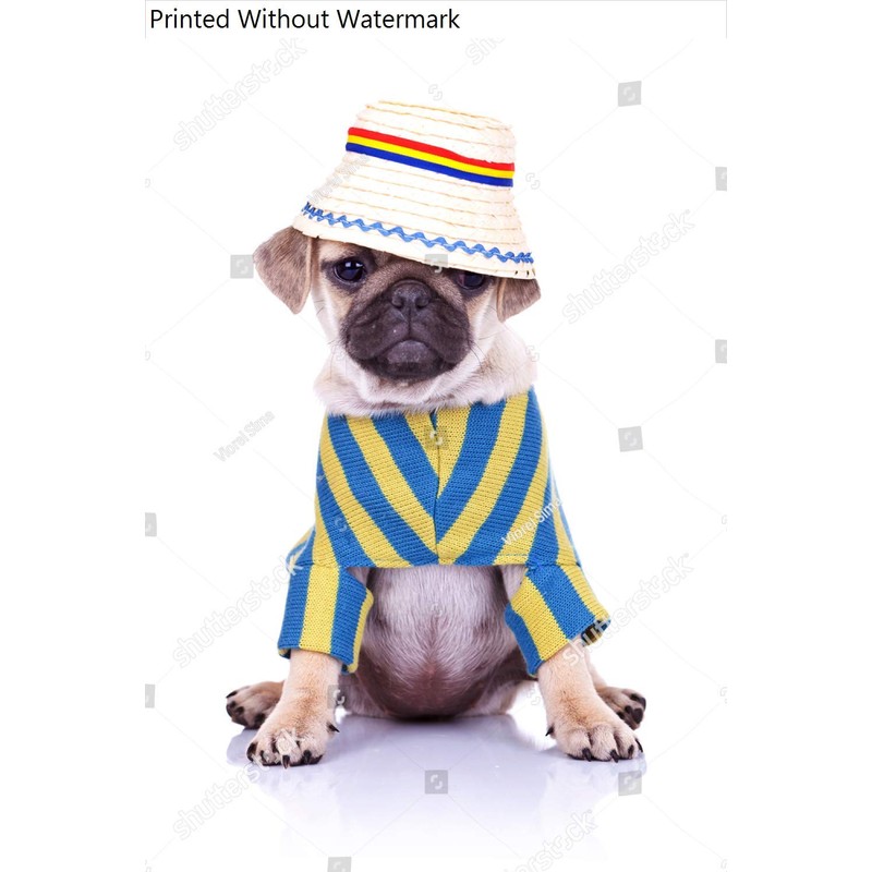 HardPress Wall Art Poster Print of Adorable Pug Puppy Dog Sitting Wearing Clothes and a Traditional Romanian Hat Looking Away from The Camera. on White Background