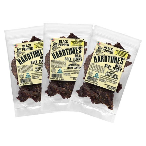 - TASTY BLACK PEPPER: Sprinkled with delicious cracked black pepper, Hardtimes Black Pepper Beef Jerky has just enough spice that you'll be craving more after the bag is empty.