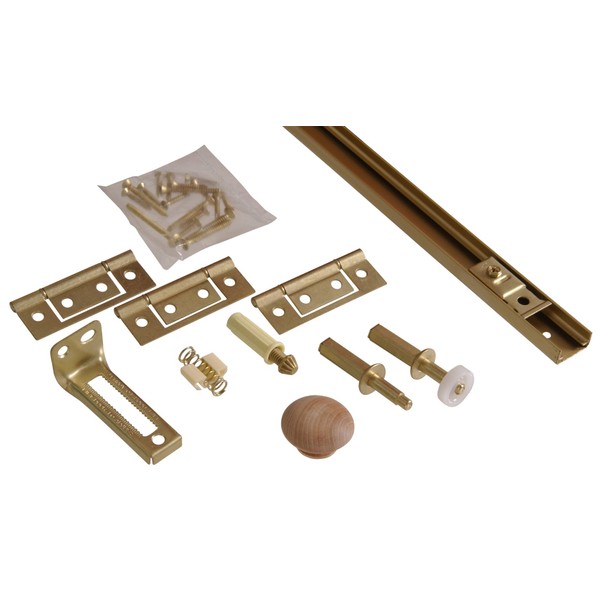 - Includes: (1) 48-inch track, (6) non-mortise hinges, (2 of each ): top and bottom pivots, and roller guide, (2) jamb bracket supports, door bumper, (2) wood knobs, and (2) aligners