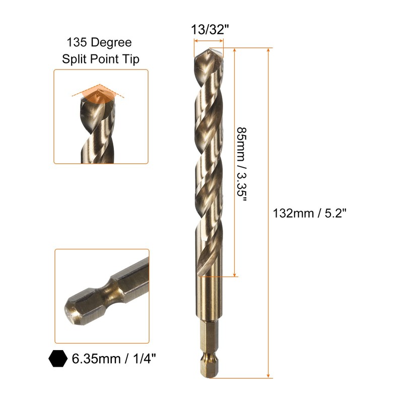 - Size - Cutting Diameter: 13/32"; Cutting Length: 85mm / 3.35"; Shank Size: 6.35mm / 1/4"; Shank Type: Hex Shank; Split Point Tip: 135 Degree; Total Length: 132mm / 5.2"
