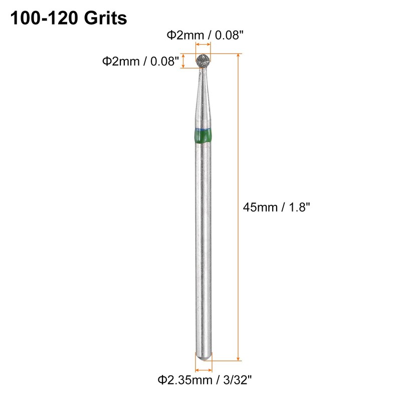 HARFINGTON 100-120 Grits Diamond Grinding Bit 2mm Ball Head 2.35mm Shank 2mm Length Stone Sanding Drill Bits Rotary Tool for Ceramic Glass Nails Grinding Polishing