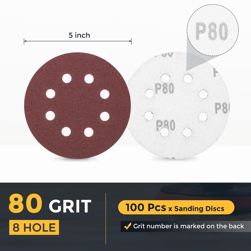 HARFINGTON 100 Pcs 5 Inch Sanding Disc 8 Hole 80 Grit Hook and Loop Sandpaper Random Orbital Sander Pads for Woodworking Automotive Metal Polishing
