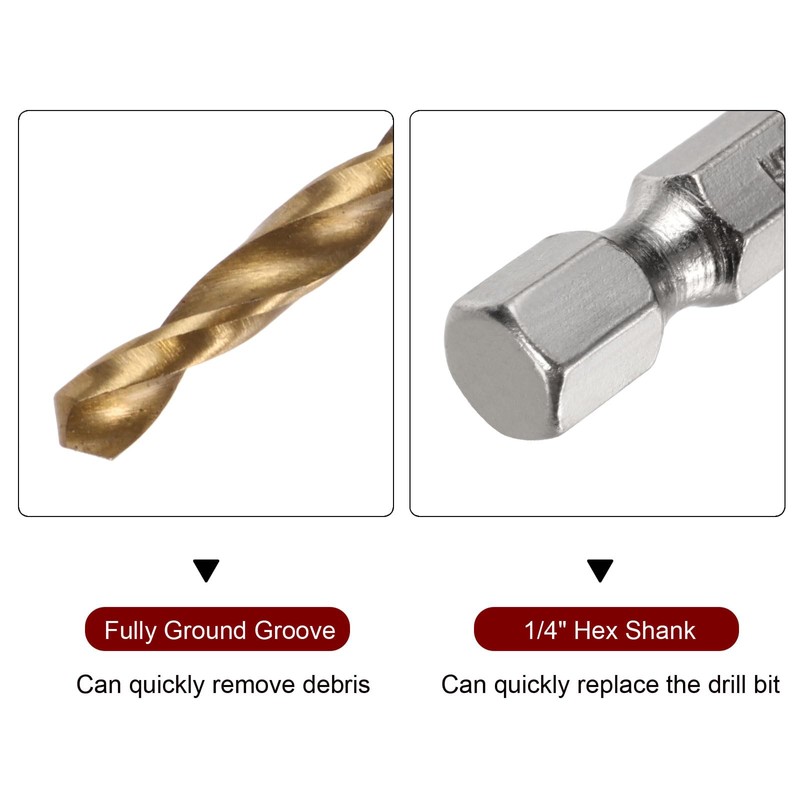 • Material - The hex drill bit is made of M35 cobalt high speed steel with sharp edge. The surface is coated with titanium, which has higher hardness, better wear resistance and longer service life than ordinary drills.