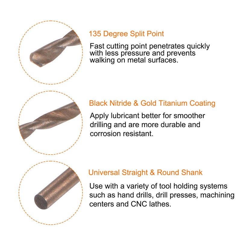 Black nitride and gold titanium dual coatings can apply lubricant better for smoother drilling and are more durable and corrosion resistant. Large spiral grooves facilitate the export of metal chips, saving time an effort. The 135 degree fast cutting point penetrates quickly with less pressure and prevents walking on metal surfaces.