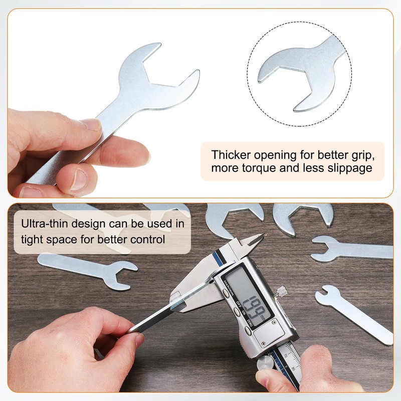 - Size - Open end: 24mm / 0.95"; Open outside width: 40.5mm / 1.59"; Total length: 115mm / 4.53"; Stem thickness: 2.8mm / 0.11"; Stem width: 12.3mm / 0.48"; Color: Silver-grey; Package includes: 10 x Single open-end wrenches. The open wrench set is thin enough to work on tight spots.