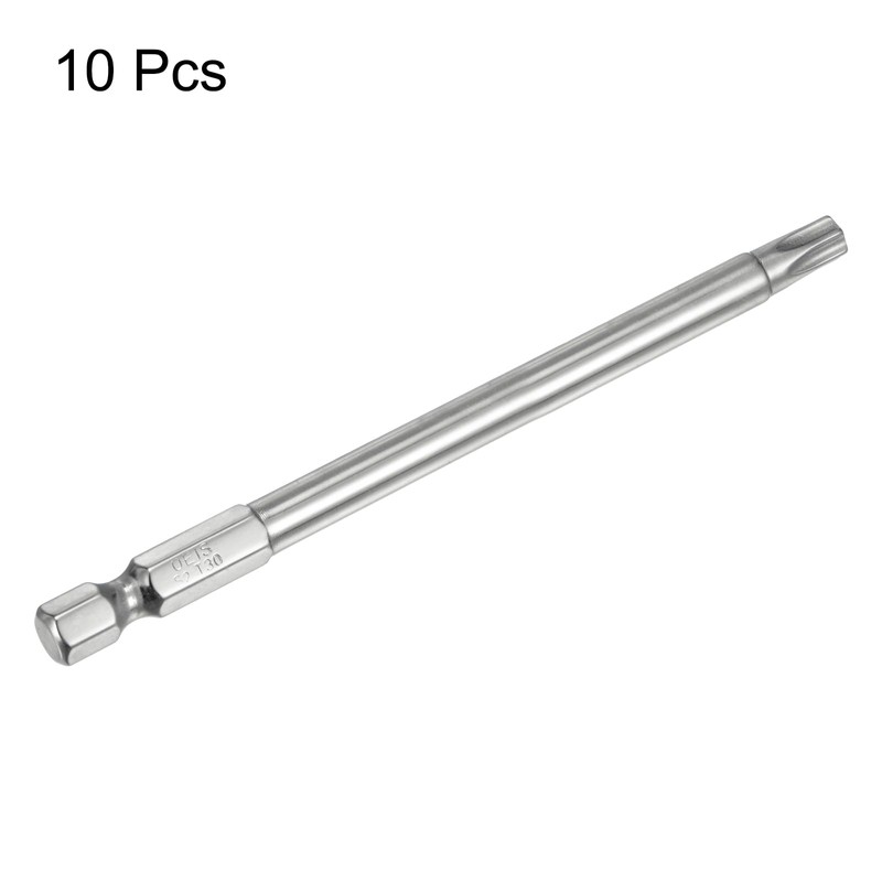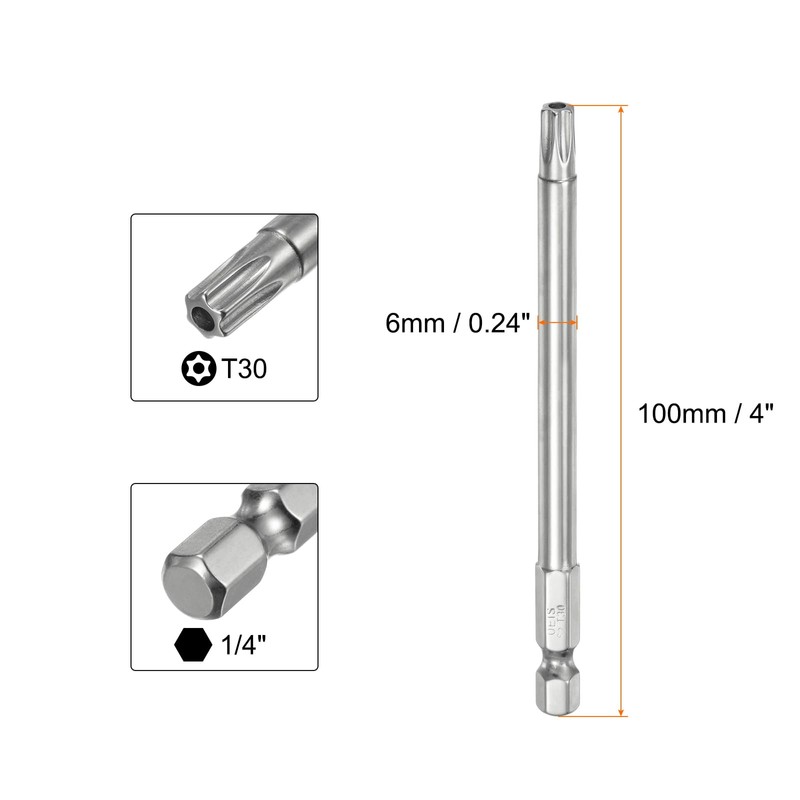 - Size - Tamper-proof torx bit size: T30, hex shank size: 1/4", total length: 100mm / 4", hardness: HRC58-60, style: torx head with hole. Each hex screwdriver bit is clearly engraved with size number for easy identification.