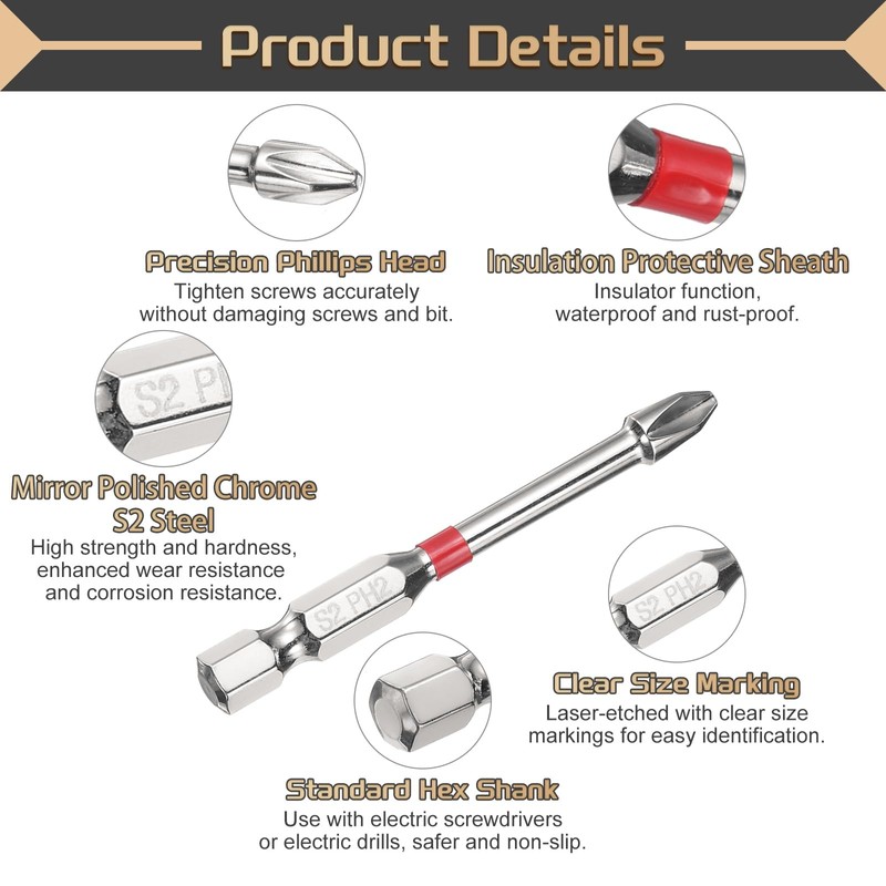 - Material - Impact screwdriver bits are made of specially heat-treated S2 steel, offering high strength and hardness (HRC58-60). They feature a bend-resistant design and a mirror polished chrome surface treatment that significantly enhances appeal while also offering corrosion resistance.