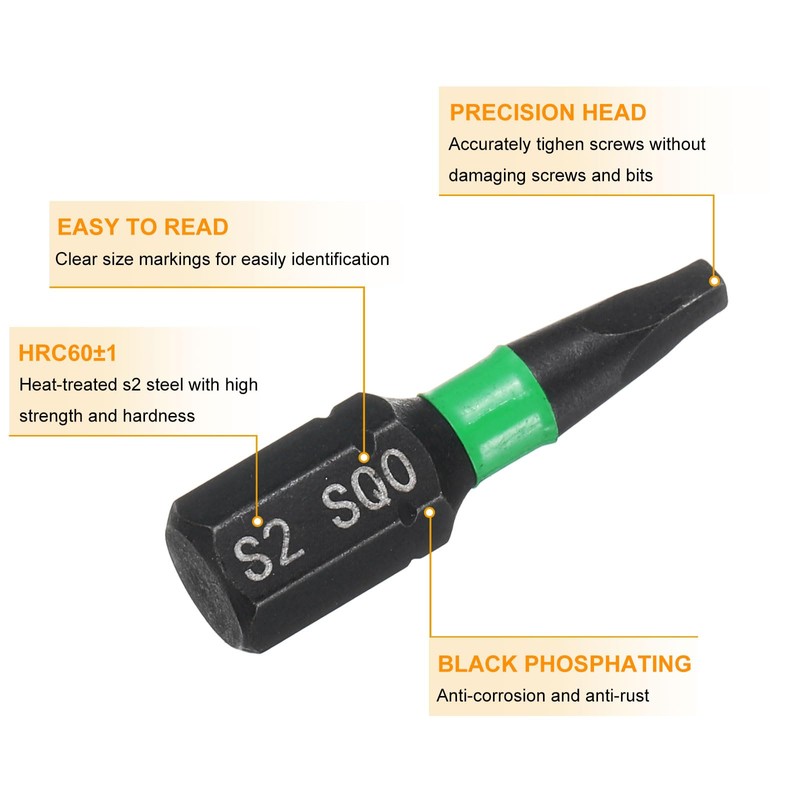 - Material - The square screwdriver bits are made of specially heat-treated S2 steel with high strength and hardness (HRC59-61), durable and anti-bending, and the surface is sandblasted for enhanced grip and corrosion resistance, suitable for industrial use.
