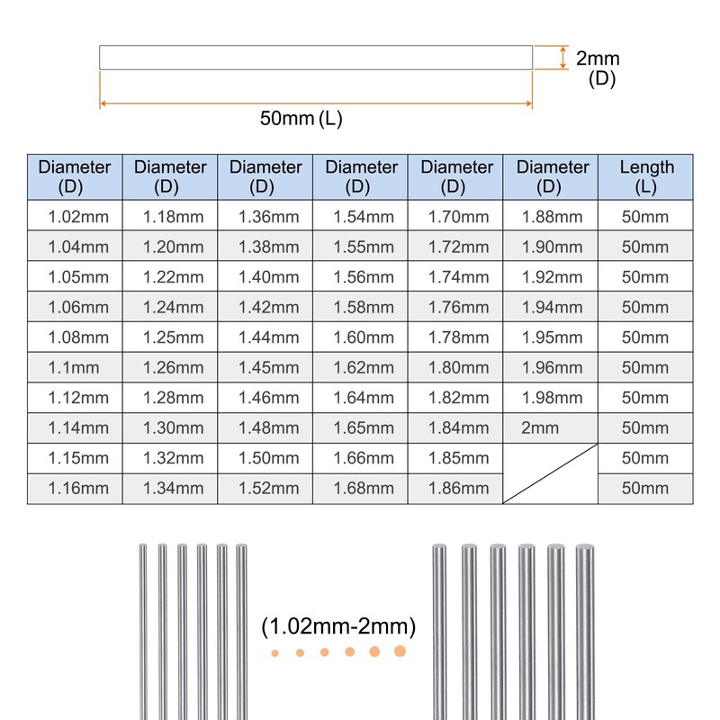 - Size - 2 pieces of 2mm pin gage, each gauge size is clearly marked. Tolerance: ± 0.001, length: 50mm/2-inch, surface roughness: <0.2um.