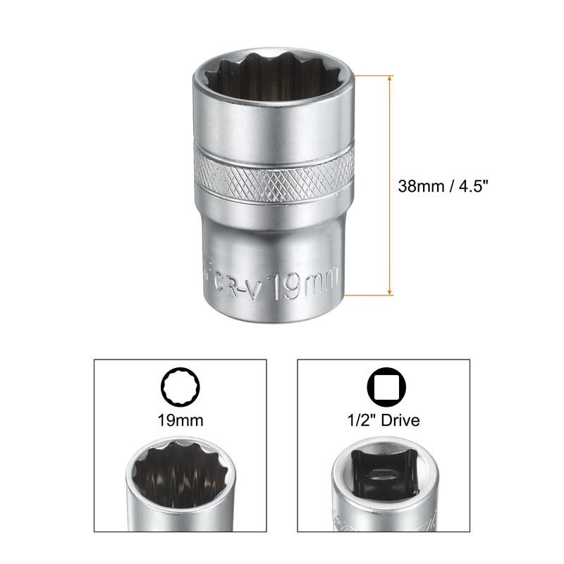 - Size - 1/2" (12.5mm) square drive, 19mm 12-point socket, 38mm (1.5") total length.