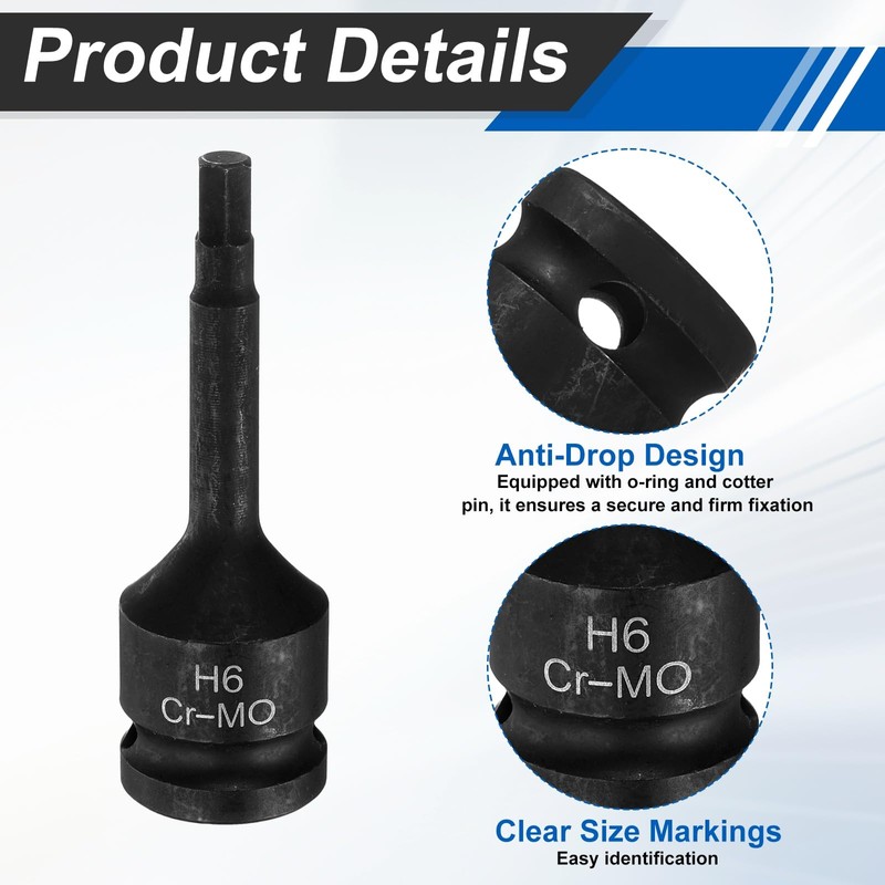 - Size - 6mm 6-point socket; 1/2" square drive socket; 78mm / 3" total length. Each package includes 2pcs x 6-point socket and 2pcs x cotter pin and 2pcs x O-ring