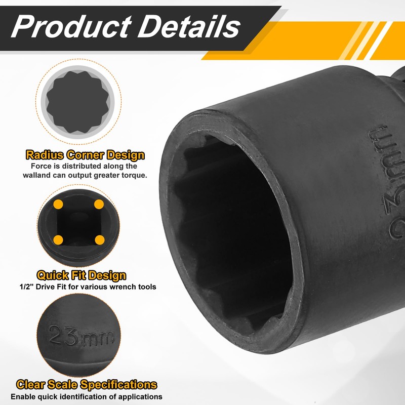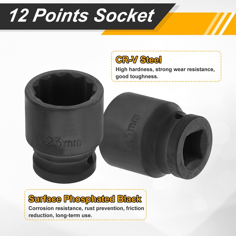 - Size - Square Drive: 1/2"; Metric 12-point Socket: 23mm; Overall Length: 38mm / 1.5". The specifications are marked on the surface of the impact socket for easy identification and improved work efficiency.