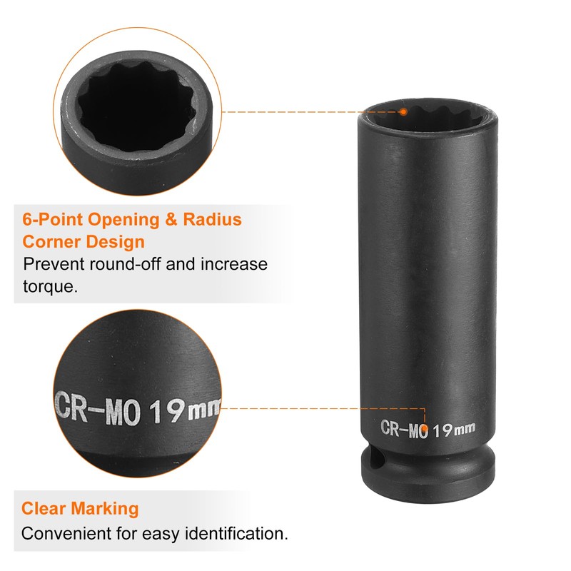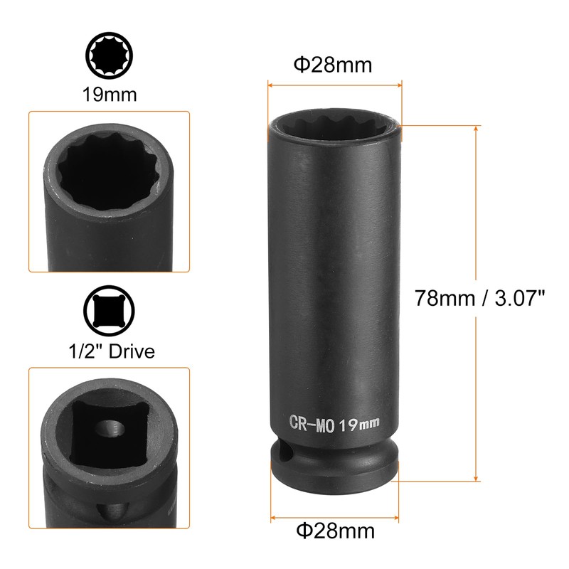 - Size - Drive: 1/2-inch, 12-Point Socket Size: 19mm, Total Length: 78mm / 3.07-inch. The specifications are clearly marked on the surface of the socket, which is easy to identify and improves work efficiency.