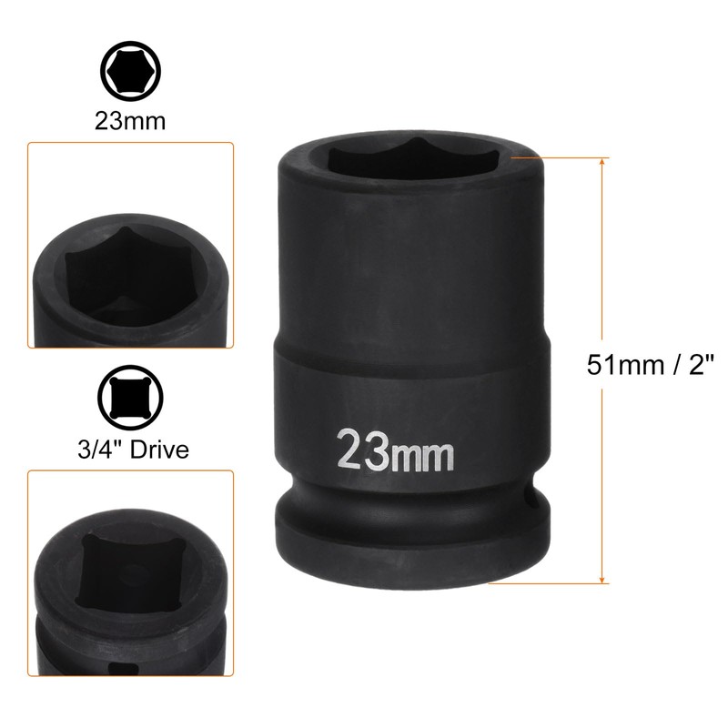 • Size - Drive: 3/4-inch, 6-Point Socket Size: 23mm, Total Length: 51mm / 2-inch. The specifications are clearly marked on the surface of the socket, which is easy to identify and improves work efficiency.