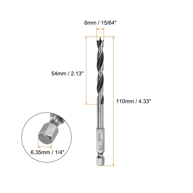 - Size - 2pcs brad point wood drill bit diameter: 6mm / 15/64"; Working length: 54mm / 2.13"; Total length: 110mm / 4.33". Shank diameter: 6.35mm / 1/4".