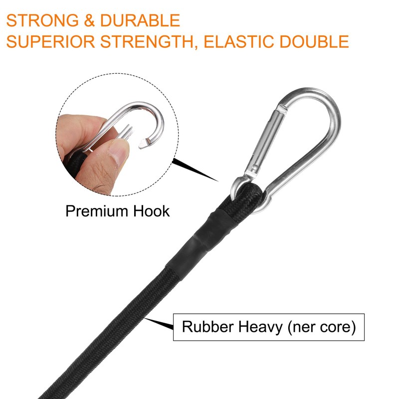 - Applications - These elastic ropes with hooks are widely used in bike racks, cars, tent poles, roof luggage racks, trailers, tents, tarpaulins, and more. A prominent application is securing heavy items on car roofs or truck compartments.