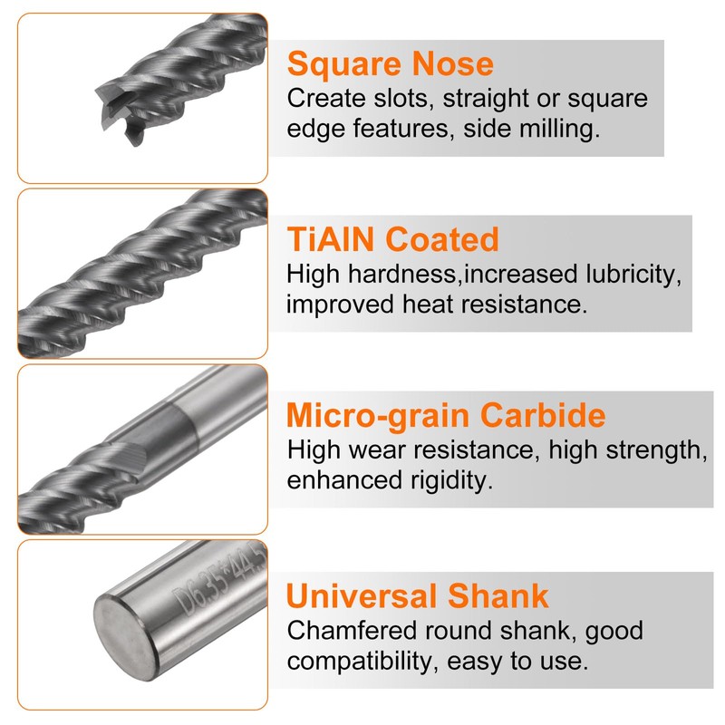 - Material - TiAlN (Titanium Aluminum Nitride) coating provides high hardness, increased lubricity, and improved heat resistance. Performs well under high-temperature cutting conditions and provides good wear resistance. Micro-grain carbide mill bit has high hardness, high wear resistance, high strength, enhanced rigidity and high temperature resistance.