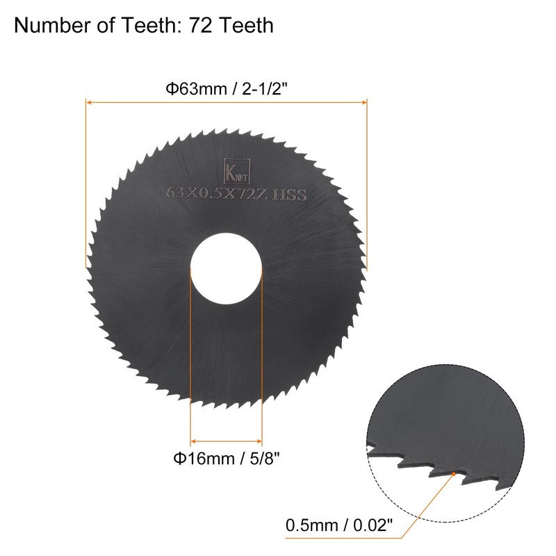 - Size - Diameter: 63mm / 2-1/2"; arbor size: 16mm / 5/8"; thickness: 0.5mm / 0.02"; number of teeth: 72 teeth; hardness: HRC63-65