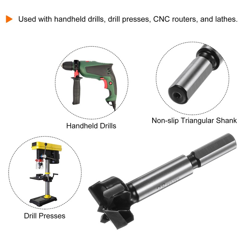 - Applications - The forstner bit is suitable for softwood, hardwood, solid wood, plywood, laminate and MDF. Easily drills flat-bottomed and pocket holes with precise, smooth finish. Widely used for furniture joints and woodworking projects, such as mortise joints, dowels, hinge cups, shelf pin, pocket screw.