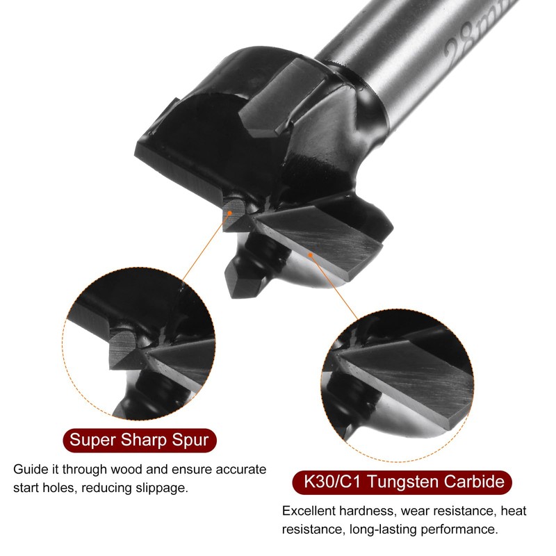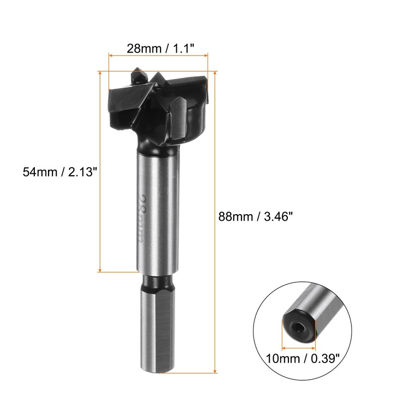 - Size - Drilling diameter: 28mm / 1-3/32"; shank size: 10mm / 13/32"; drilling depth: 54mm / 2-1/8"; total length: 88mm / 3-15/32" (The forstner drill bit is specially designed for industrial use.)