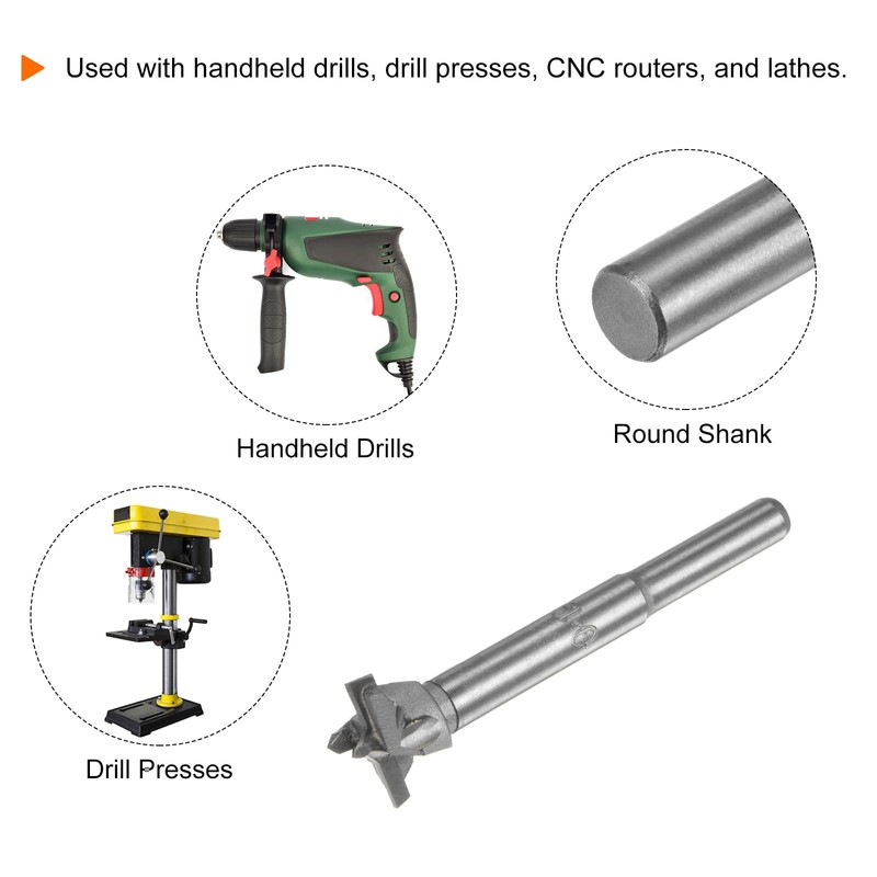 Used with handheld drills, drill presses, CNC routers, and lathes. High-speed steel round shank can be used with most standard drill chucks and drill drivers, making it easy to interchange and use with a variety of drilling tools. Recommended to use on desktop (fixed) equipment. Always keep the forstner bit firmly in place when drilling.
