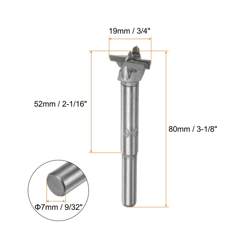 - Size - Drilling diameter: 19mm / 3/4"; shank size: 7mm / 9/32"; drilling depth: 52mm / 2-1/16"; total length: 80mm / 3-1/8"; design: 2 cutters, 3 spurs; shank type: round shank (can be used with most standard drill chucks and drill drivers.)