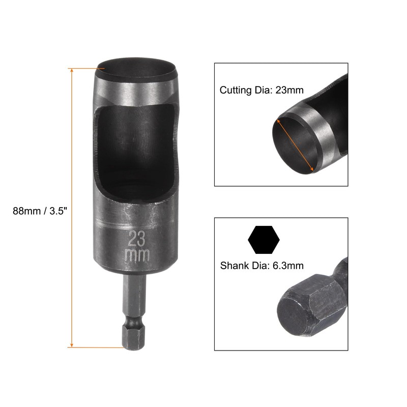 Size: 23mm leather hole punch for punching precision smooth holes in thick fabrics, leather belts, and straps. Shank Dia: 1/4" (6.35mm); Total Length: 88mm.