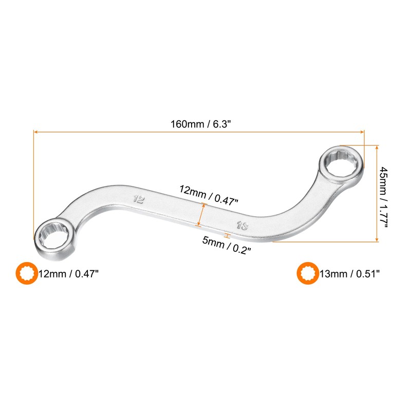- Size - Box End Size: 12mm / 0.47", 13mm / 0.51"; Total Length: 160mm / 6.3"; Total Width: 44mm / 1.73"; Handle Thickness: 6mm / 0.24"; Handle Width: 12mm / 0.47"; Package Content: 2 x Box Wrenches.