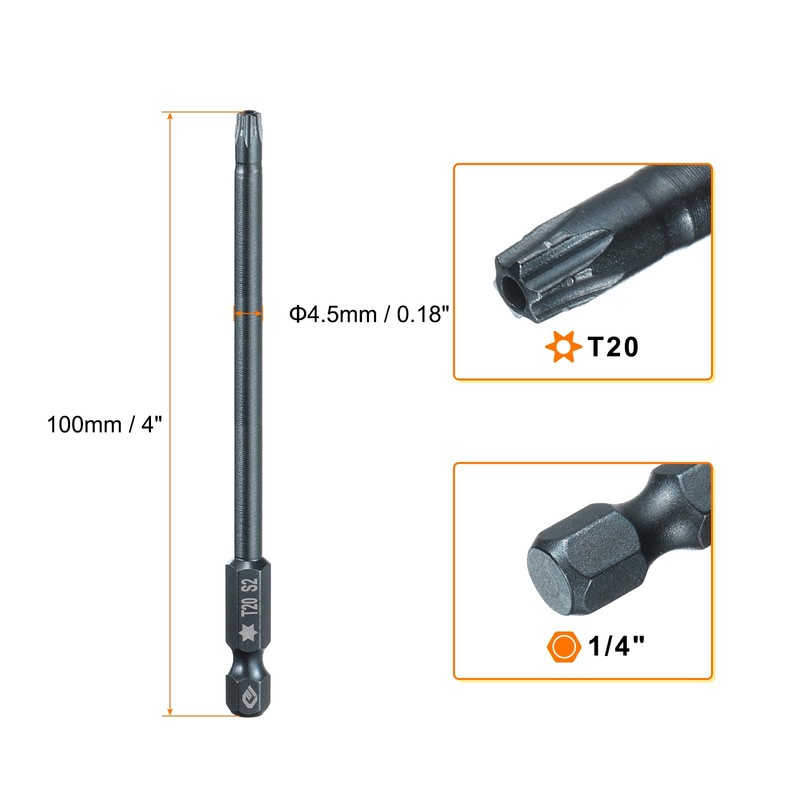 - Size - Torx Bit Size: T20, Hex Shank Size: 1/4", Total Length: 100mm / 4", Rod Diameter: 4.5mm / 0.18", hardness: HRC58-62. Each magnetic torx drill bit is engraved with a clear specification for easy and quick identification.