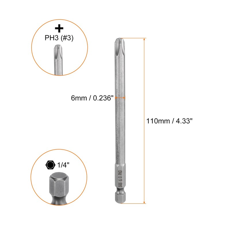 - Size - Phillips head size: PH3 (#3); hex shank size: 1/4"; overall length: 110mm / 4.33"; rod diameter: 6mm / 0.236"; hardness: HRC59-61 (The recognized stable hardness is around HRC60.). Screws for large household appliances are mainly PH2, those for small household appliances are mainly PH1, and those for precision instruments are mainly PH0/PH00/PH000.