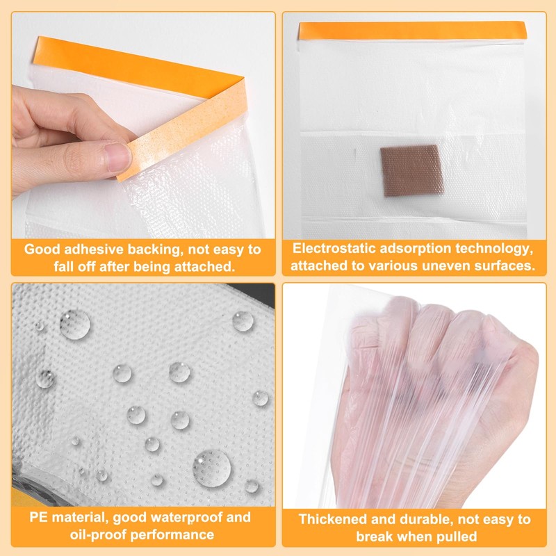 The painting plastic covering film is pre-taped, no additional tape tools or accessories are required, it can be firmly adhered to the surface, easy to use on walls, cabinets or cars