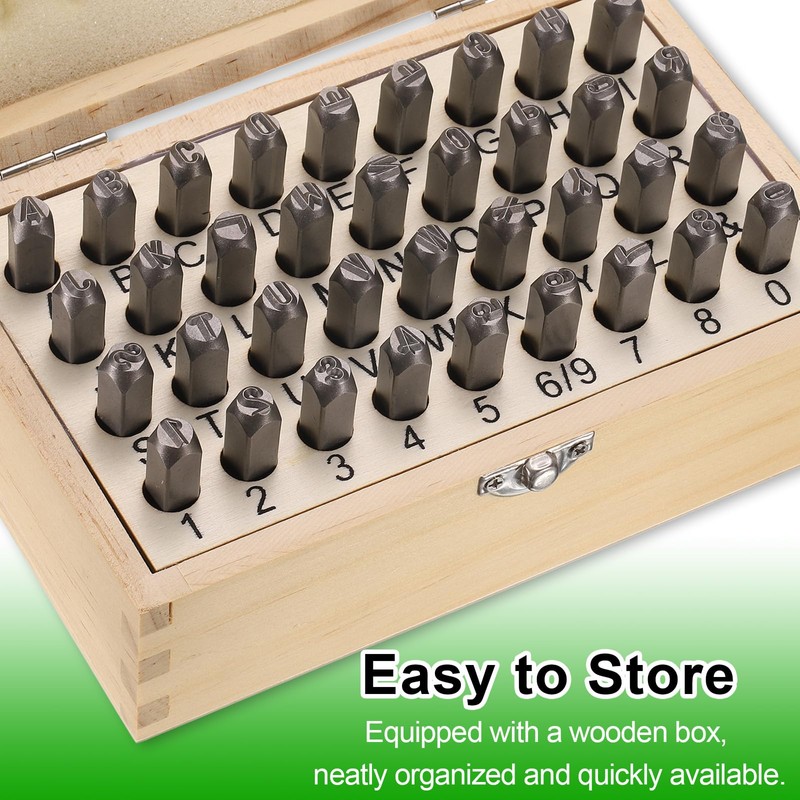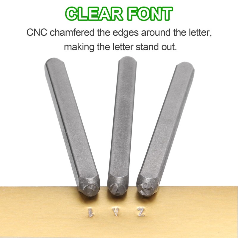- Size - Letters: 6x6mm / 0.24x0.24 inch (LxW); Steel bars: 64*8*8mm / 2.5x0.32x0.32 inch (LxWxH); Package includes: 36 x metal punch stamps (26 uppercase letters from A to Z, numbers from 0 to 8, an '&' symbol, the "6" stamp can be used as a "9")