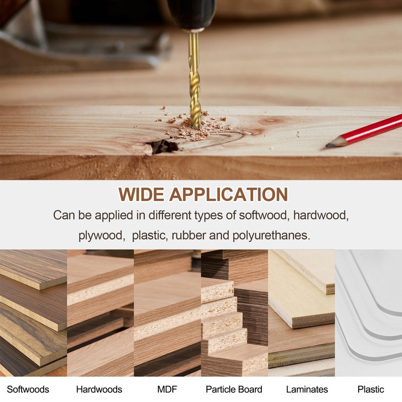 • Application - Suitable for various drill drivers, such as bench drills, electric drills, and cordless drills. The drill bits can be applied in different types of softwood, hardwood, plywood, plastic, rubber, and polyurethanes.