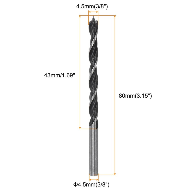 - Size - The brad point drill bits have an overall length of 80mm/3.15", with a diameter of 4.5mm(3/8") and a straight shank diameter of 4.5mm(3/8"). The maximum cutting depth can be up to 53mm/2.09".