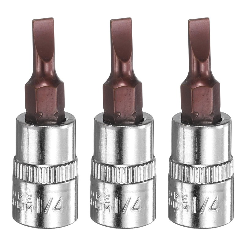 HARFINGTON 3pcs FD4 Slotted Bit Socket 1/4" Square Drive Flat Head S2 & CR-V Steel Socket Ratchet Wrench Bits, Silver Red