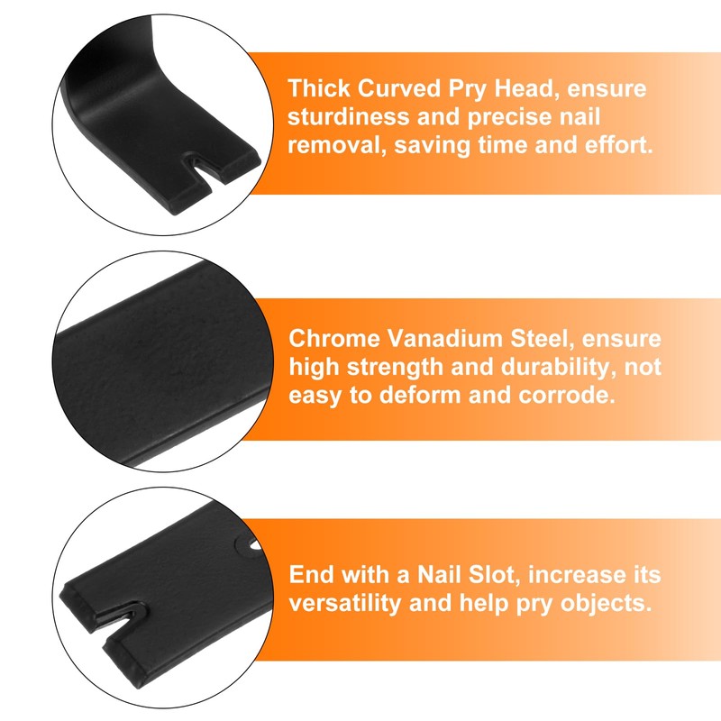 The pry head adopts a thickened design to ensure its sturdiness and durability, and also adopts a curved design to achieve precise nail removal and prying, saving time and effort. The nail remover also has a nail slot at the end for added versatility. The crowbar is finely polished to make it less likely to leave indentations and scratches on the contact surface during use.
