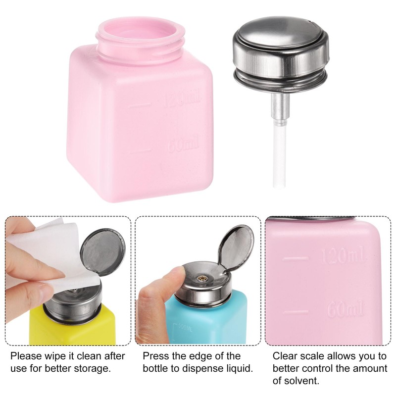 - Features - Push pump dispensers are suitable for dispensing liquids on cotton balls, brushes, and nail wipes. Just place a cotton pad on it and press on the center of the lips, the liquid will rise to the surface, soaking the cotton pad.